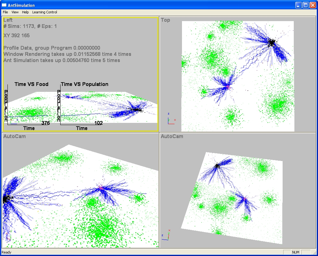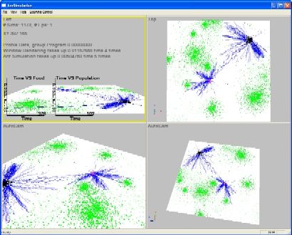 One of my favorite projects. Here is some video and the executable. The screensaver version is a bit older and contains CLIPS which is an expert system langauge so it is possible to change the behavior of the colony by editing this file.