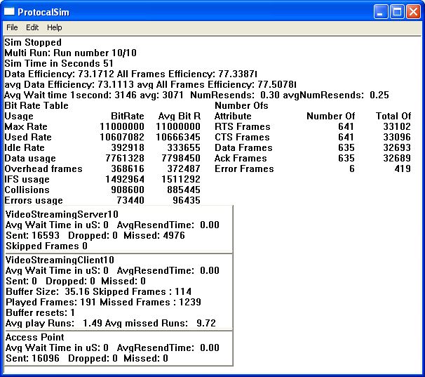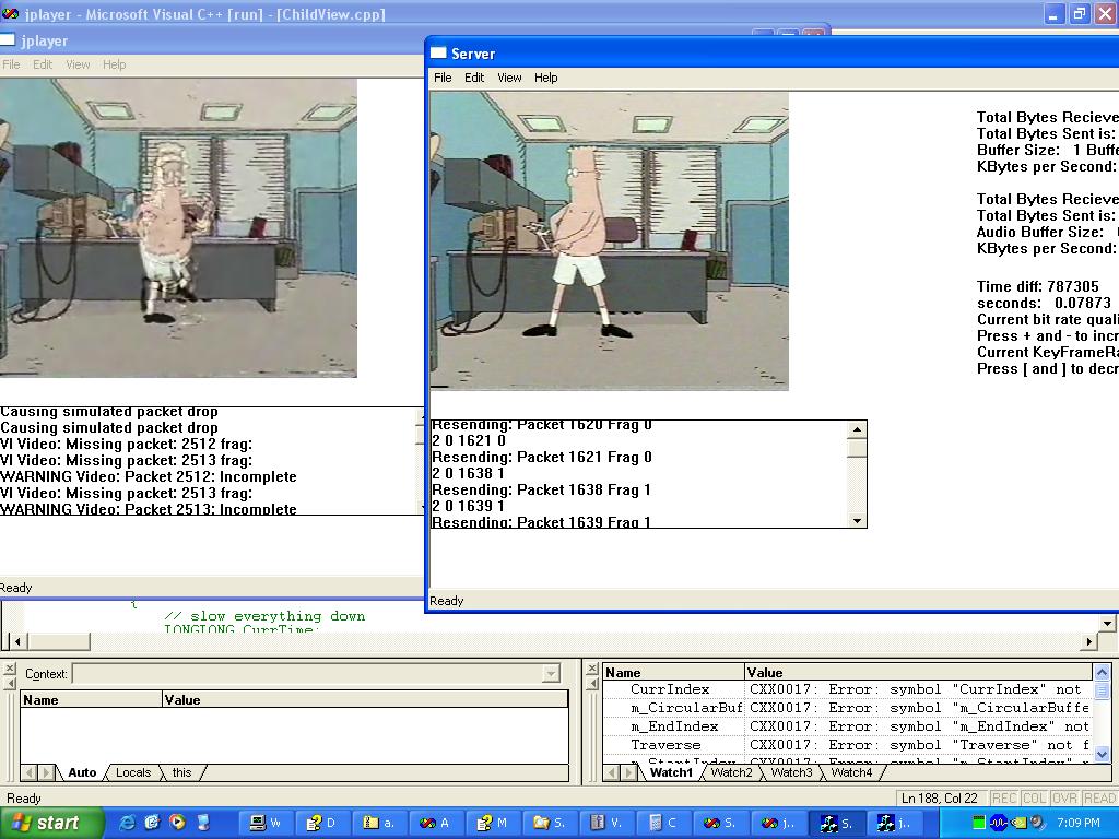 My Masters thesis consisted of the protocol simulation (below) and the implementation of the transport layer for video streaming. The theoretical simulation results were compared with the actual video streaming results. The above is a picture of the streaming with simulated packet loss just to show the resend mechanism and how it could fail with a large packet loss rate.