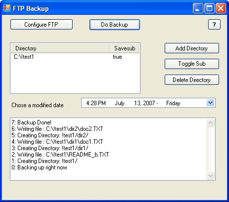 This program is used to backup selected directories, and their subdirectories if selected into an ftp site. The program creates a directory in the ftp site that contains the date time of the backup. This is a good way to have one click archiving to an ftp site without overriding any other version of those files.