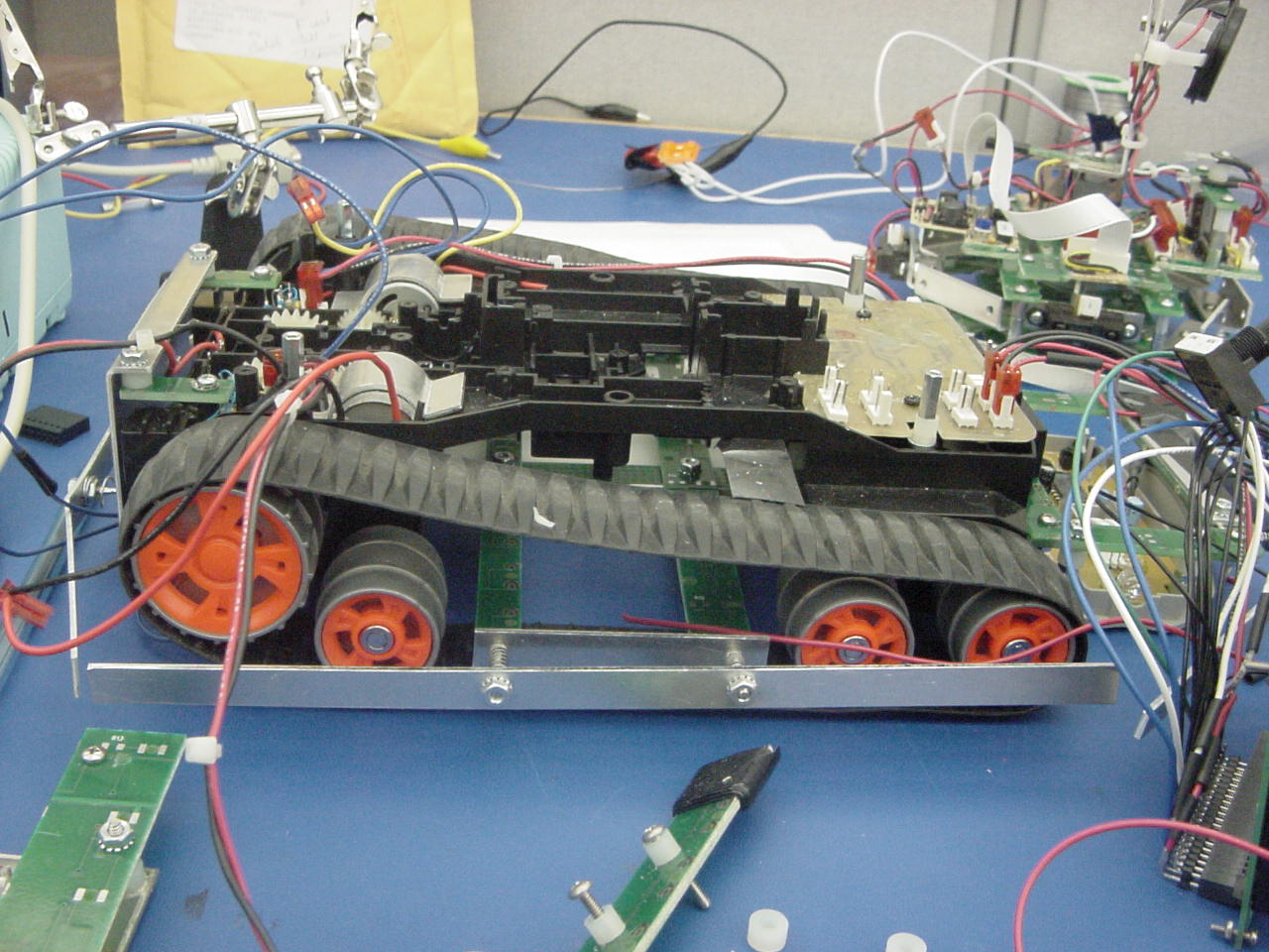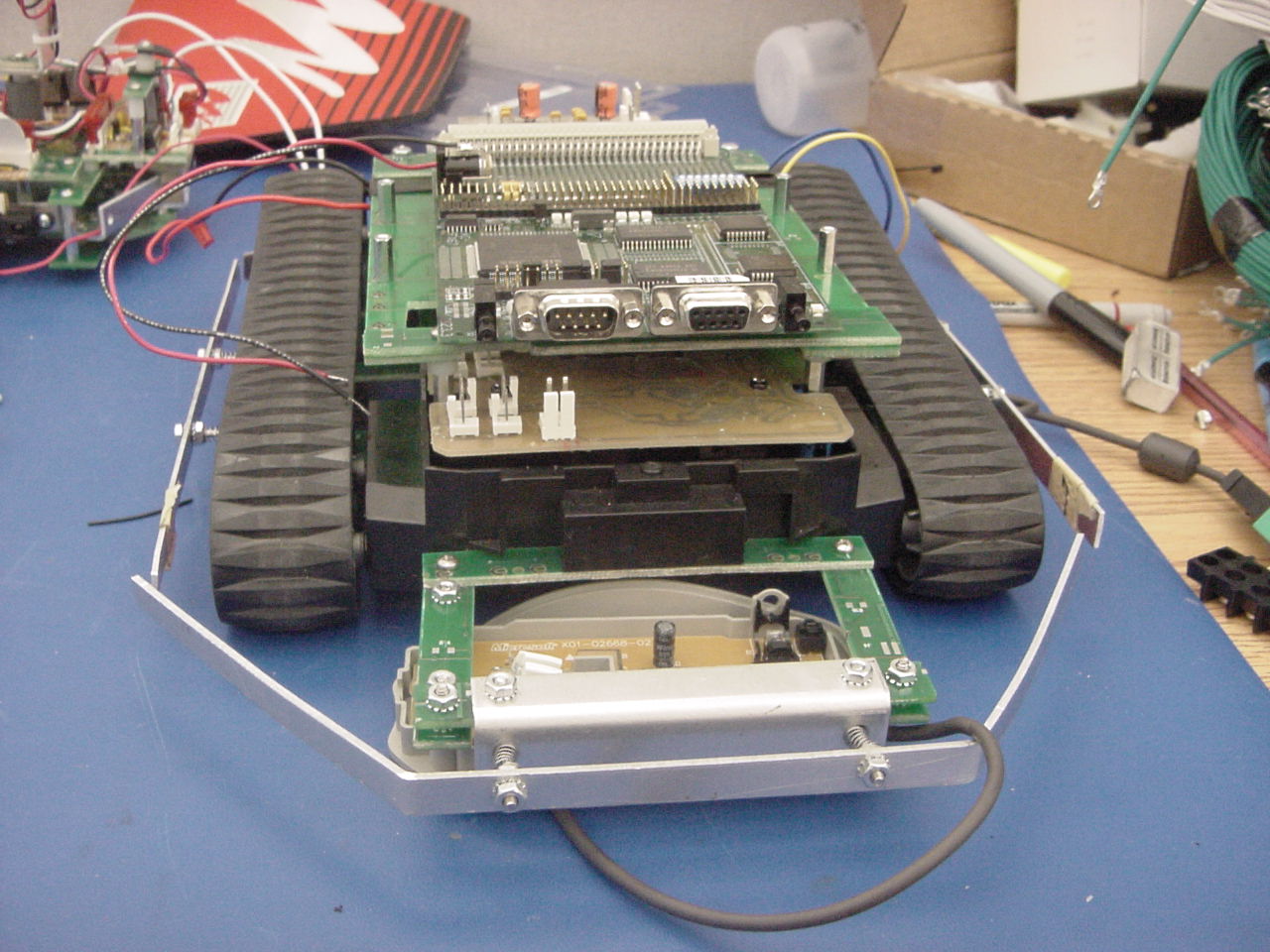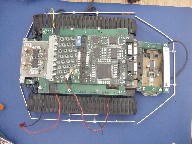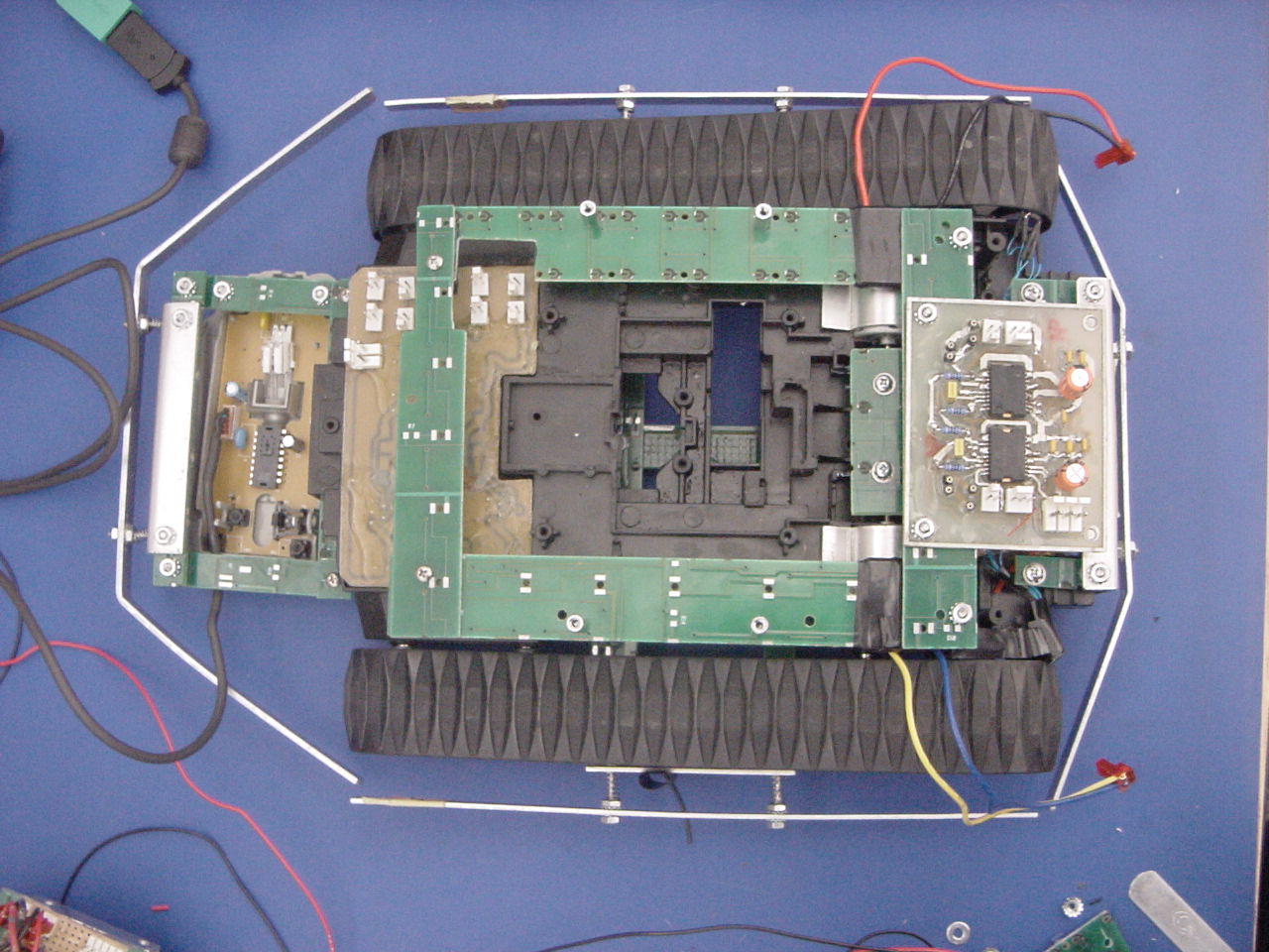 Here are some pictures of when I was just starting to put things together. Notice now that all of the bumpers are mechanically in place. Also in the front there is the microsoft optical mouse. Notice beneath the H-Bridge PCB there is a plate to keep the gears in place. In the original R/C car this was done by the plastic cover.