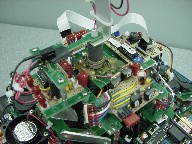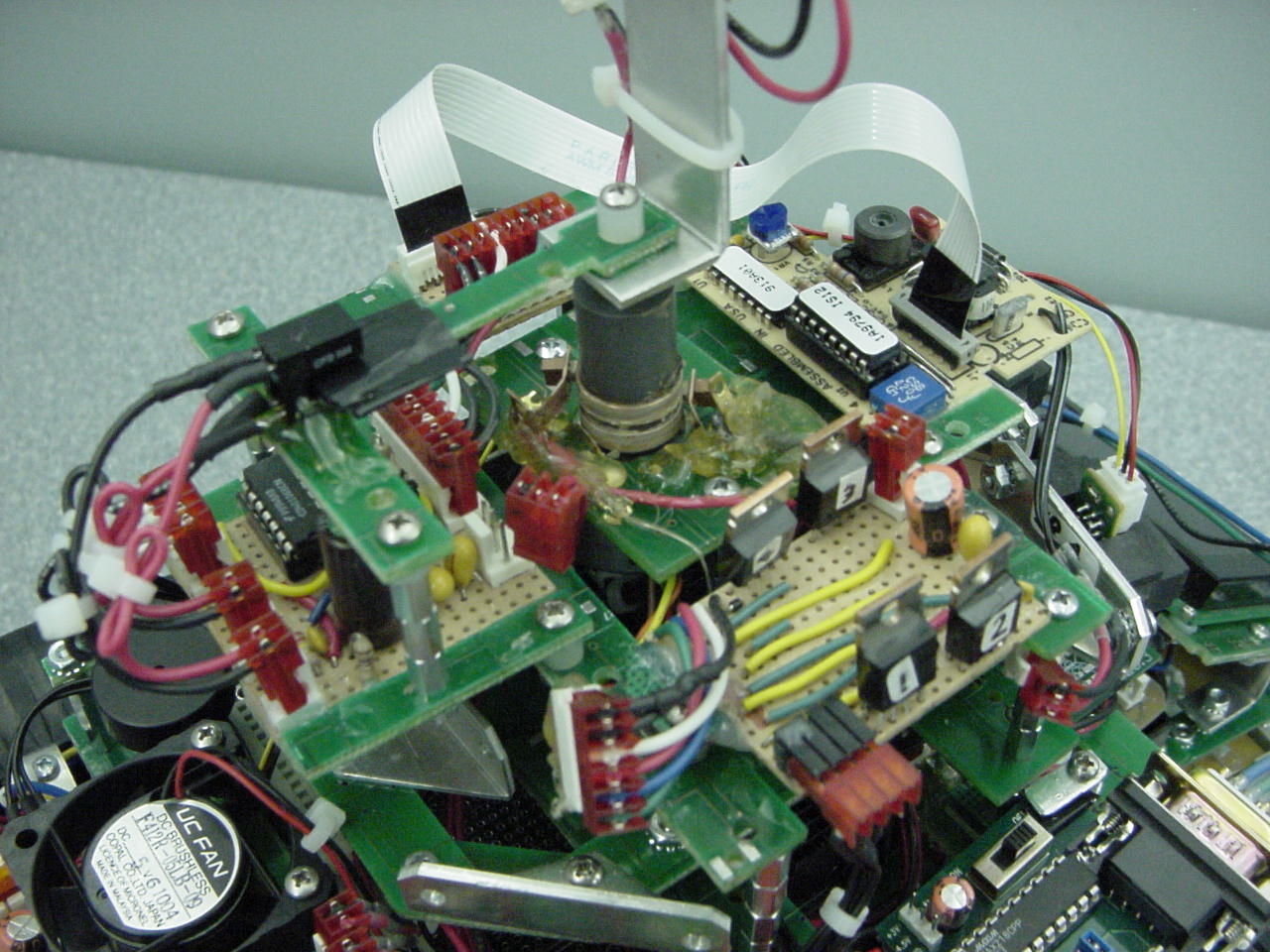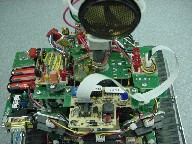 The board feature in this picture provides some interface with the 167 to the Polaroid board. It basically is the power supply, with the big capacitor, and some Schmitt inverters to clear up the edges. It also contains the electronics for the IR emitter/detector pair, which serve to indicate when the sonar is at 0 degrees relative to the robot.