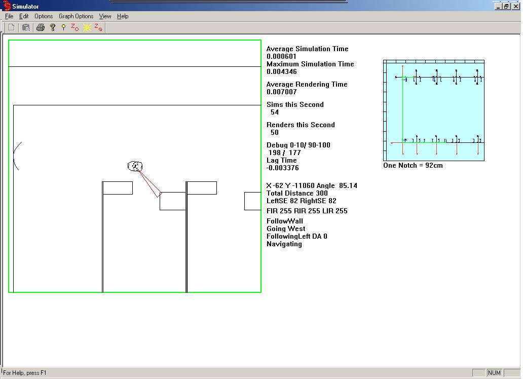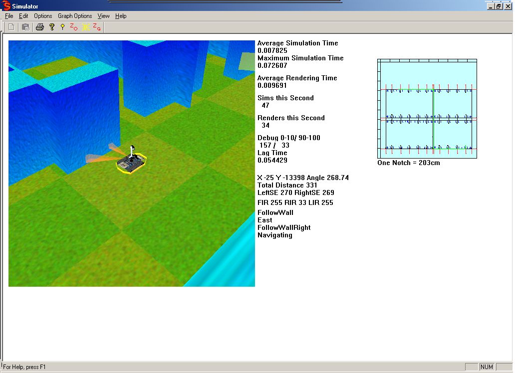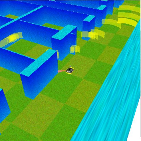 Here is the 3D rendered version of the simulation. The robot is navigating. If you zoom in on the graph (upper right) you could see its path (as specified by the green line)