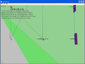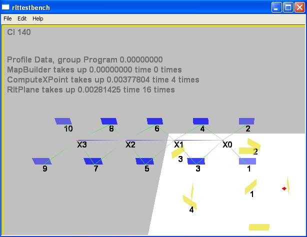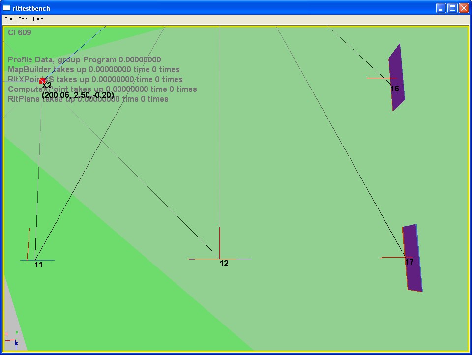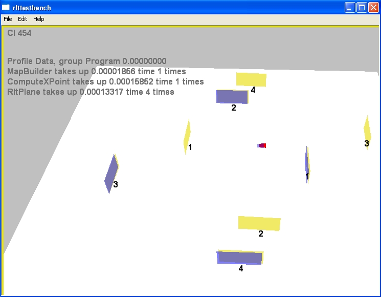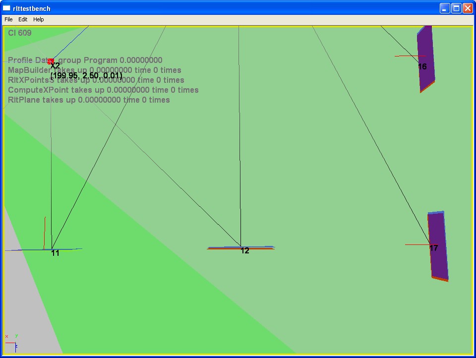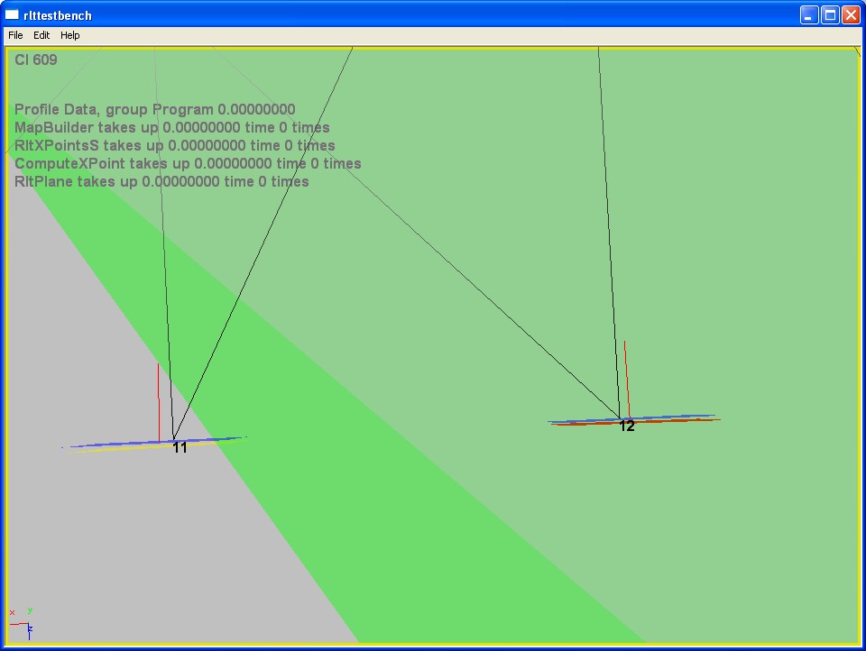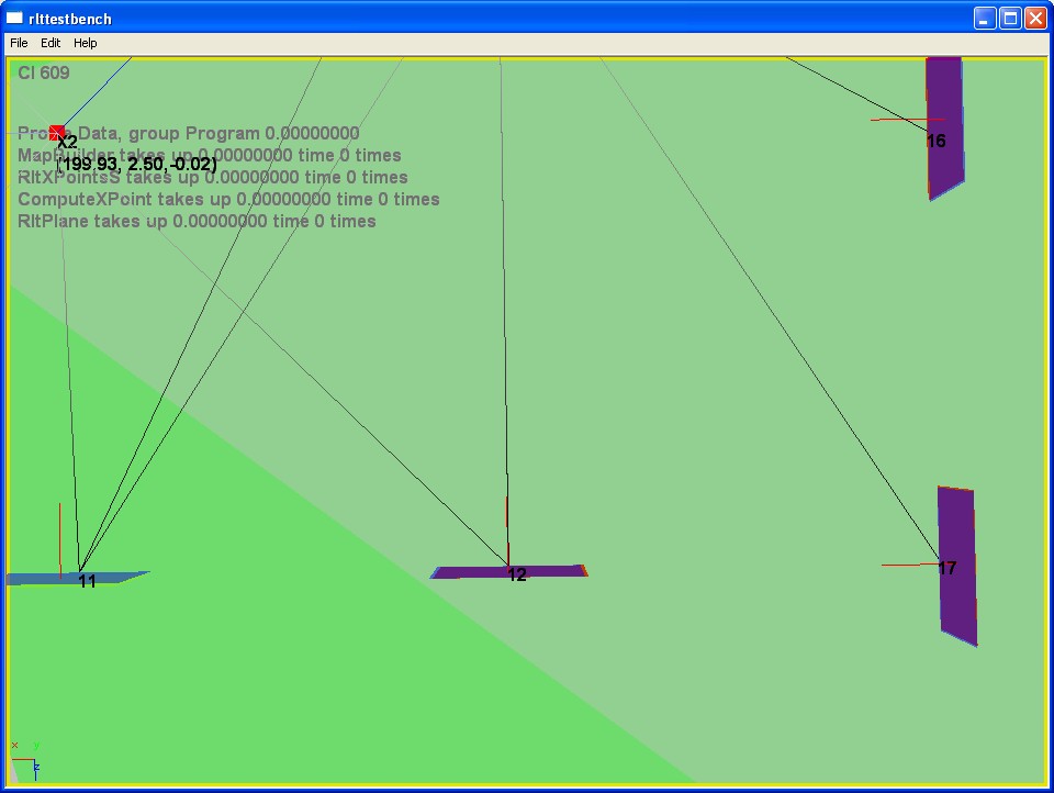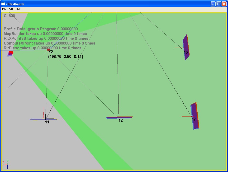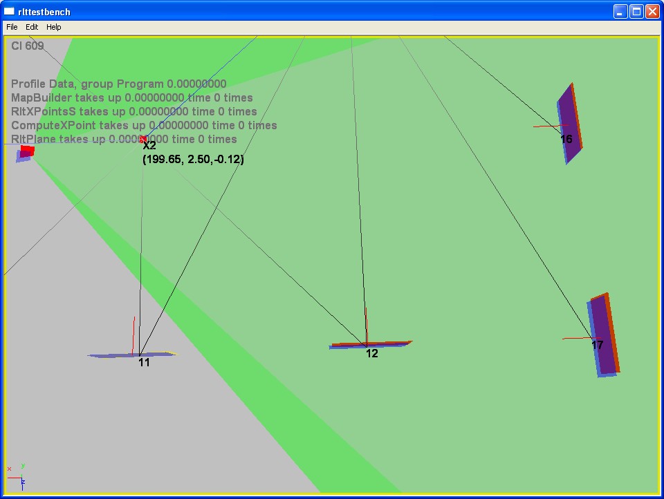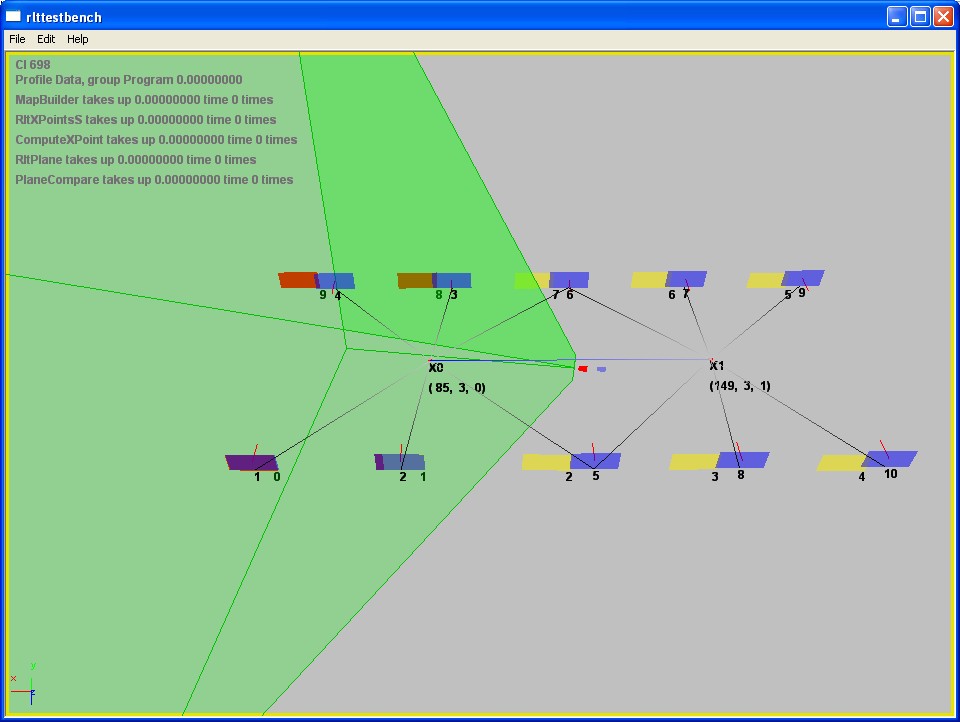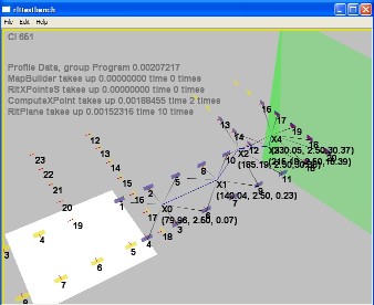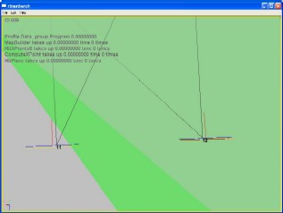 This shows the first try at relative mapping using 4 planes that are visible all the time. Notice it doesn't have any bad long term accumulation errors as the map (blue planes) pretty much stay where they are meaning the global position is only off by the error of the reading which is being compared to the map.
