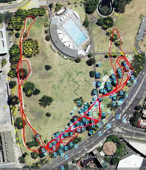 Here are the results of the first run compared to the results of http://webdiis.unizar.es/~ppinies/research.htm. The Relative Algorithm's result shown in blue squares are manually aligned to result from the above link. It is likely the alignment is not perfect, but it shows that the Relative Algorithm results are generally consistent with the results from the EKF.