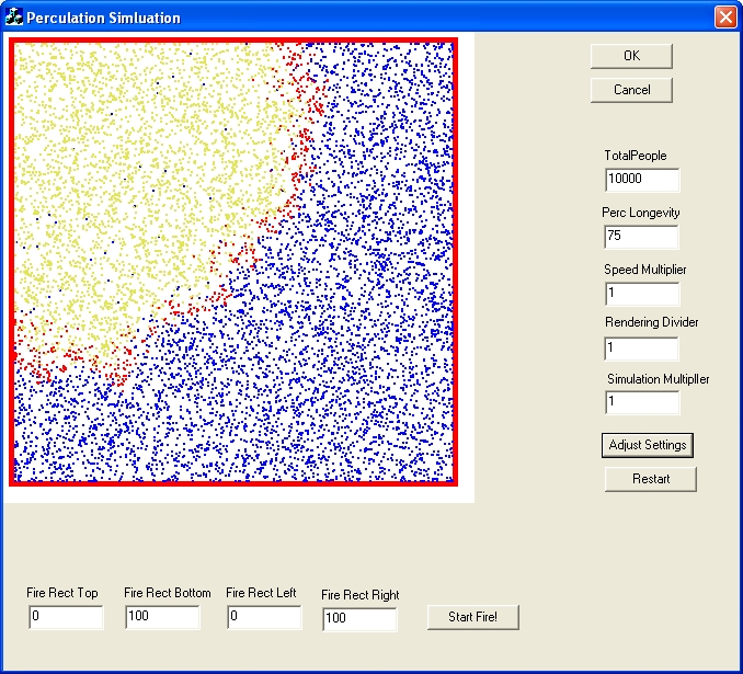 This is a simulation I did for a friend which has a bunch of "people" in a random walk and then seeding an area with "fire" The "fire" spreads between two people, once of which is on fire already. The fire only last for so long and then that person stops moving and is no longer infectious. The fire forms a wave which pretty much gets everyone except for a few.