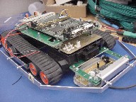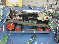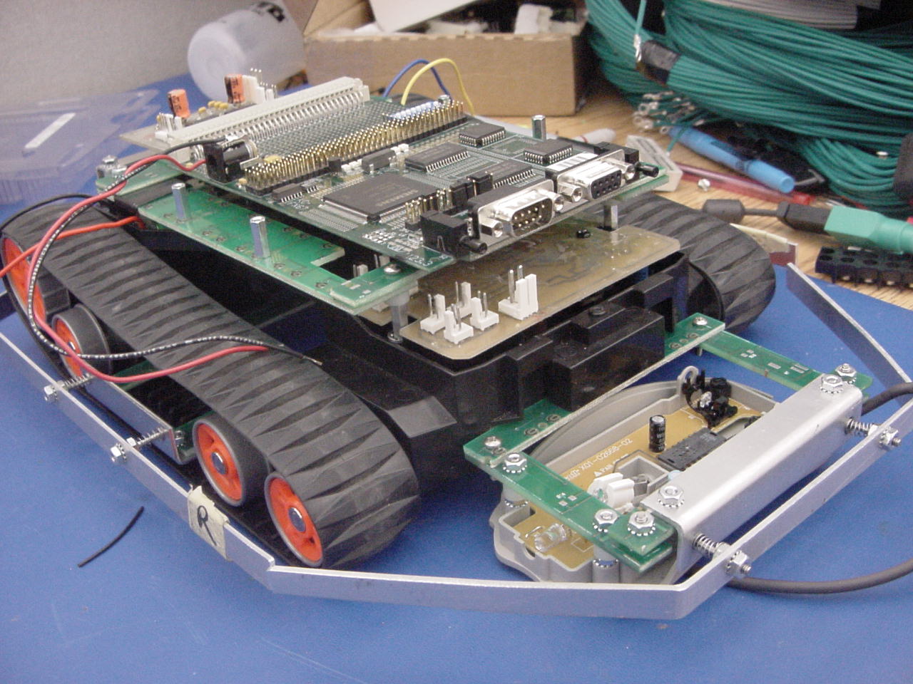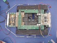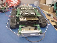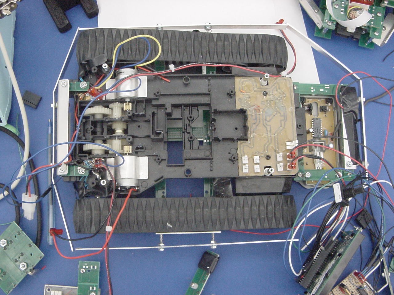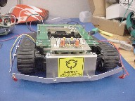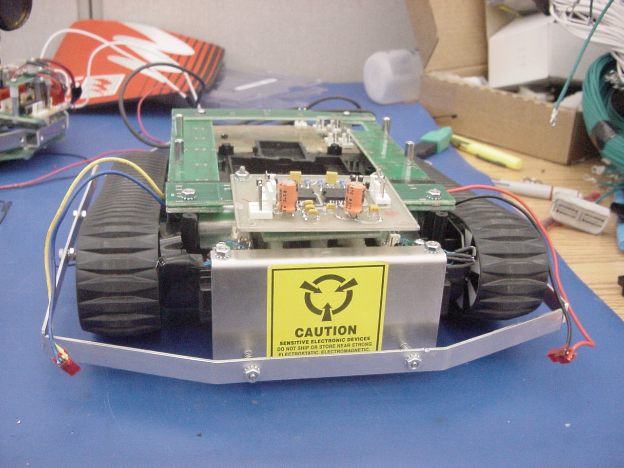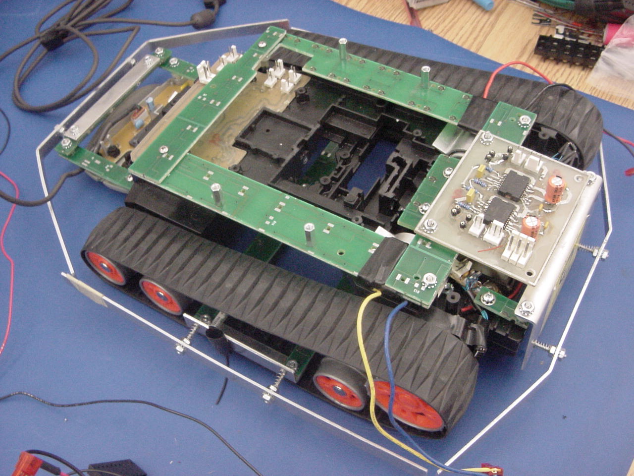 Here are some pictures of when I was just starting to put things together. Notice now that all of the bumpers are mechanically in place. Also in the front there is the microsoft optical mouse. Notice beneath the H-Bridge PCB there is a plate to keep the gears in place. In the original R/C car this was done by the plastic cover.