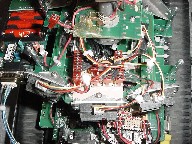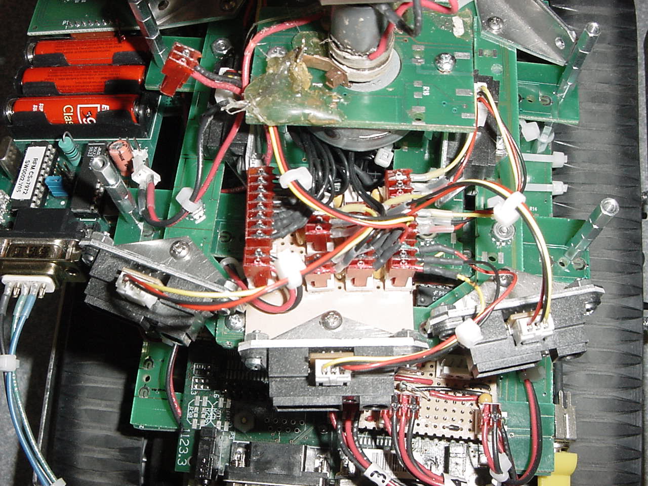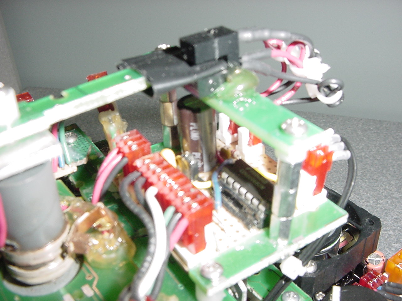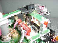The board feature in this picture provides some interface with the 167 to the Polaroid board. It basically is the power supply, with the big capacitor, and some Schmitt inverters to clear up the edges. It also contains the electronics for the IR emitter/detector pair, which serve to indicate when the sonar is at 0 degrees relative to the robot.