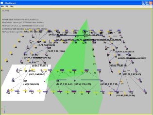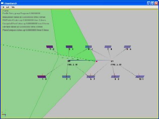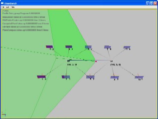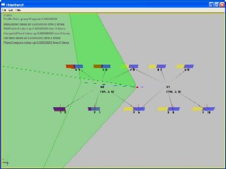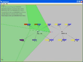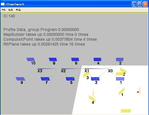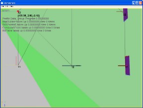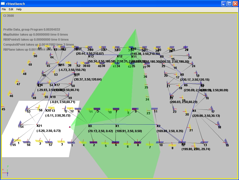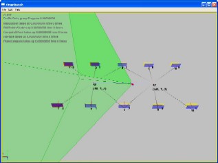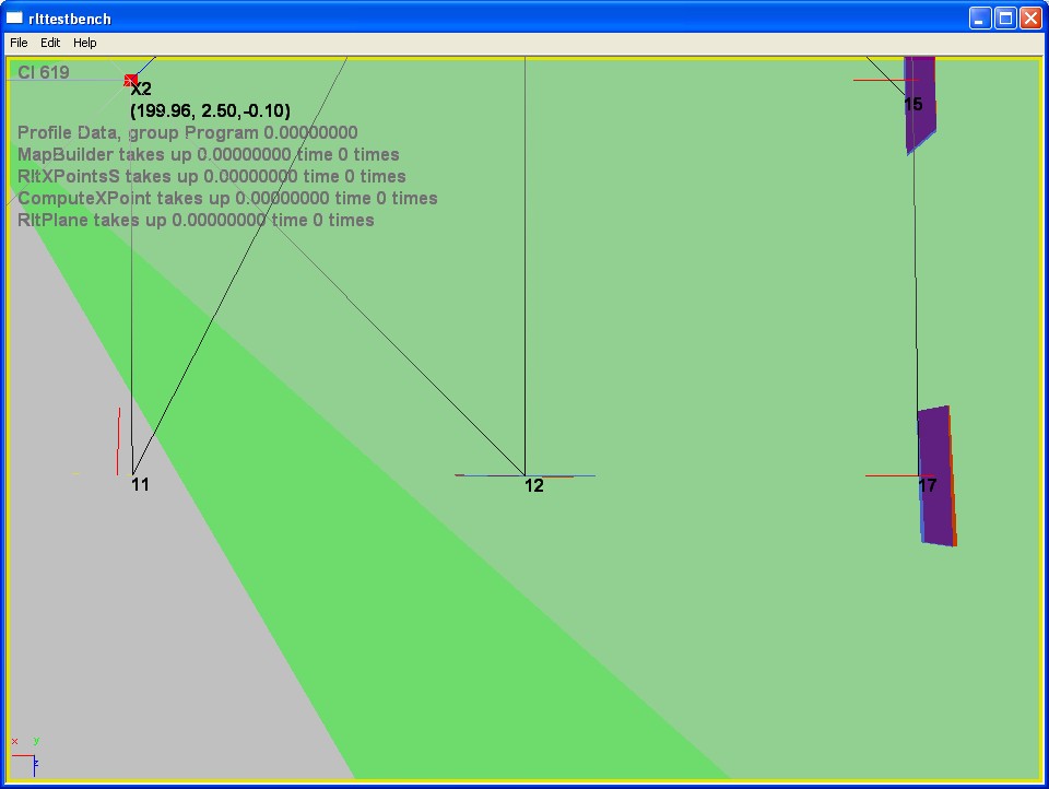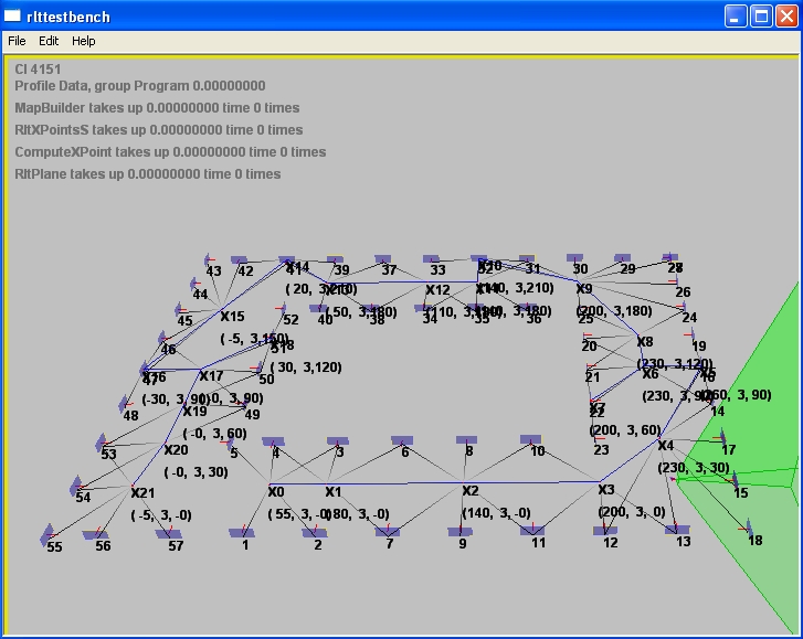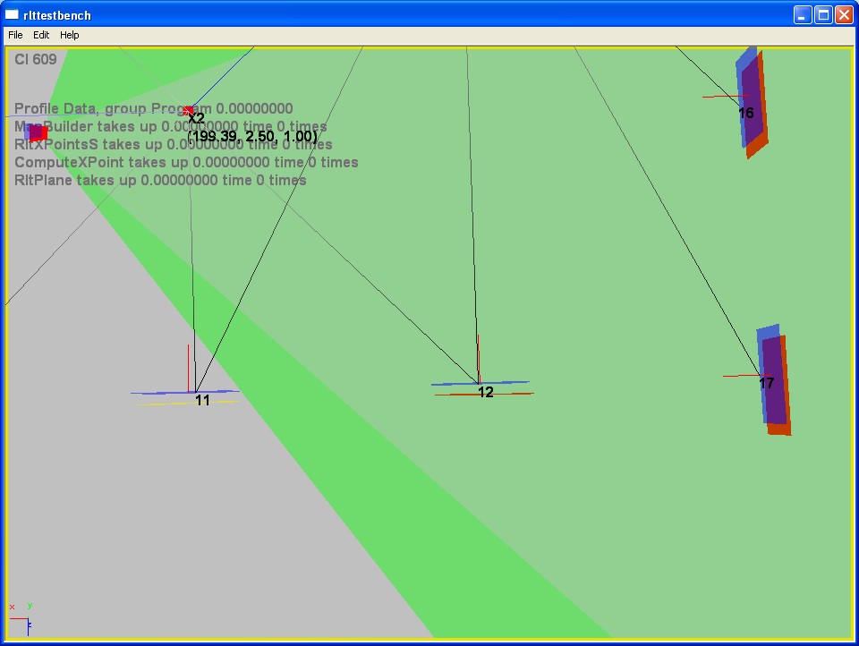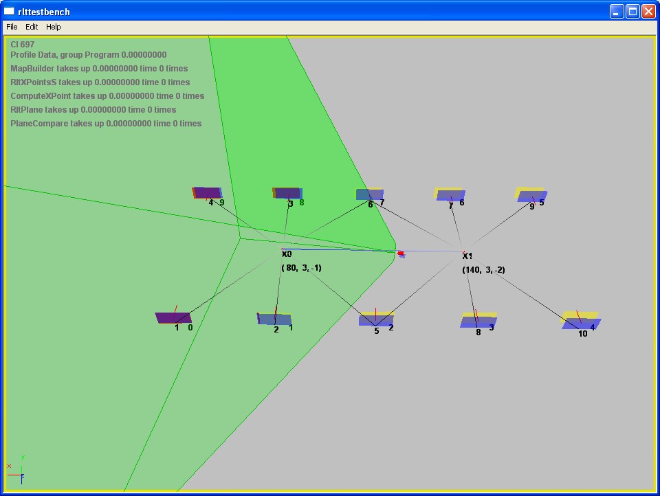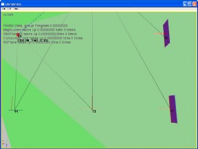 This shows the first try at relative mapping using 4 planes that are visible all the time. Notice it doesn't have any bad long term accumulation errors as the map (blue planes) pretty much stay where they are meaning the global position is only off by the error of the reading which is being compared to the map.