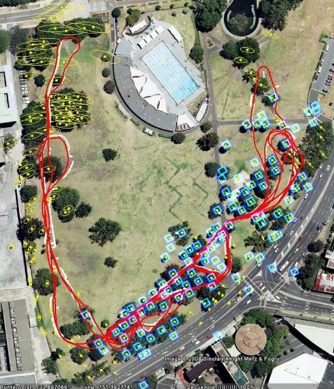 Here are the results of the first run compared to the results of http://webdiis.unizar.es/~ppinies/research.htm. The Relative Algorithm's result shown in blue squares are manually aligned to result from the above link. It is likely the alignment is not perfect, but it shows that the Relative Algorithm results are generally consistent with the results from the EKF.